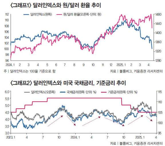 하지만 이런 기업의 비용 증가와 불확실성에 따른 투자 보류 등은 결국 노동시장 둔화로 이어지며 성장 부진 우려를 불러일으키고 수요 측면의 인플레이션 압력을 완화할 것이다. 따라서 대외 불확실성이 큰 환경이지만, 올해 2분기와 3분기 중 약세 구간에 머물던 미국달러는 하반기 후반으로 갈수록 트럼프 관세 불확실성이 완화되고 미국 성장이 회복되면서 완만하게 반등할 것으로 보인다.원/달러 환율 역시 미국달러 흐름에 주로 연동해 움직일 것으로 전망된다. 당분간 1400원대에서 변동성이 커질 수 있겠지만, 추경 편성 등 경기 부양을 위한 정책적 대응이 이어진다면 단기적으로 원화는 달러 대비 강세를 보이며 1400원대 초반까지 하락할 수 있다. 그리고 하반기 후반으로 갈수록 원/달러 환율도 1400원 중반대로 다시 반등하는 U자형 경로가 진행될 것으로 예상된다.
