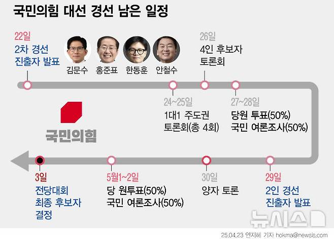 [서울=뉴시스] 국민의힘은 21~22일 양일간 100% 일반 국민 여론조사를 실시해 김문수·안철수·한동훈·홍준표 후보를 2차 경선 진출자로 선출했다. 오는 29일 3차 경선 진출자 2명을 결정한다. 다만 과반 득표자가 나오면 후보로 확정되고 3차 경선은 열리지 않는다. (그래픽=안지혜 기자)