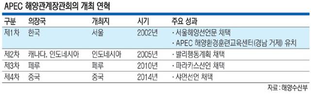 APEC 해양관계장관회의는 아시아·태평양 역내 해양 및 연안자원의 지속가능한 이용에 대한 21세기 해양 비전 정립을 논의하고자 지난 2002년에 설립된 회의체다. 역내 해양협력을 주도하려는 취지에서 한국의 적극적 역할을 통해 창설됐으며 그해 서울에서 1차 회의가 열리기도 했다. 당시 채택된 ‘서울해양선언문’은 △해양자원관리 문제에 관한 논의 및 관리법 개선 △수산식품 품질과 안전을 포함한 어획 후 과정 개선 △무역 및 투자 자유화의 촉진을 위한 사업 등의 내용을 담기도 했다.