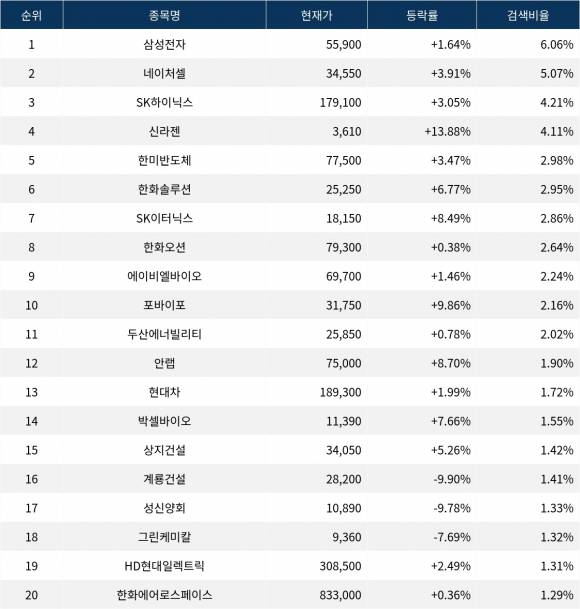 이어 네이처셀(007390)이 검색비율 2위를 기록하며 3.91%의 상승세를 기록하고 있다. 검색비율 3위의 SK하이닉스(000660)는 3.05% 상승하며 순조로운 출발을 하고 있다. 검색비율 4위 신라젠(215600)은 개장 초반부터 13.88%의 급등세를 보이고 있다. 검색비율 5위 한미반도체(042700)는 3.47% 상승하며 상승세를 유지하고 있다.