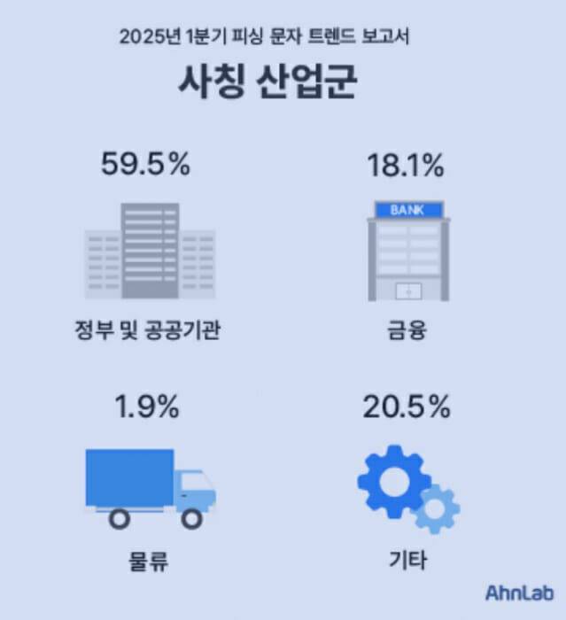 피싱 문자 공격자가 사칭한 산업군 비중은 ▲정부·공공기관(59.5%) ▲금융(18.1%) ▲물류(1.9%) 순으로 나타났다.