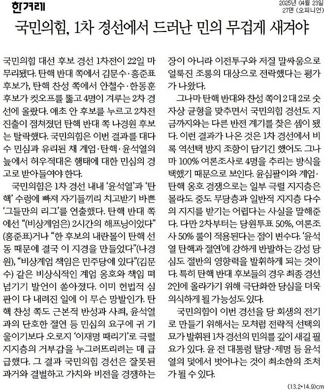 한겨레 = 국민의힘, 1차 경선에서 드러난 민의무겁게 새겨야