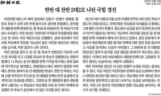 조선 = 반탄 대 찬탄 2대2로 나뉜 국힘 경선