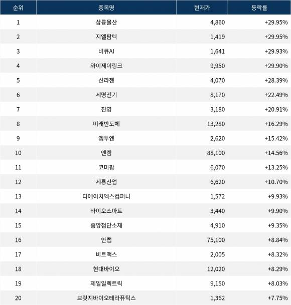 6위 세명전기(017510)는 현재가 8,170원으로 22.49% 상승 중이다. 7위 진영(285800)은 현재가 3,180원으로 20.91% 상승 중이다. 8위 미래반도체(254490)는 현재가 13,280원으로 16.29% 상승 중이다. 9위 엠투엔(033310)은 현재가 2,620원으로 15.42% 상승 중이다. 10위 엔켐(348370)은 현재가 88,100원으로 14.56% 상승 중이다.