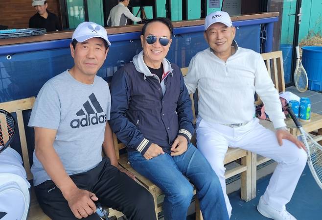 <사진> 양종수 전 육사 교장(대한테니스협회 부회장), 김성일 전 공군참모총장과 운동 중 휴식을 취하는 김인곤 고문