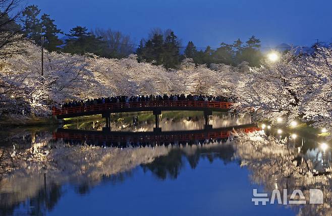 [히로사키=AP/뉴시스] 22일 일본 북부 아오모리현 히로사키의 한 공원에 벚꽃이 만개해 방문객들이 벚꽃 야경을 즐기고 있다. 2025.04.23.