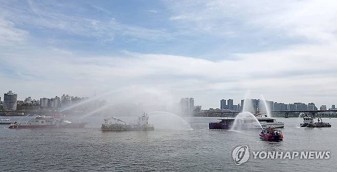 (서울=연합뉴스) 류영석 기자 = 23일 서울 마포대교 인근에서 소방대원들이 올해 상반기 정식 운항을 앞둔 한강버스의 배터리실 화재 상황을 가정한 현장 대응훈련을 하고 있다. 2025.4.23