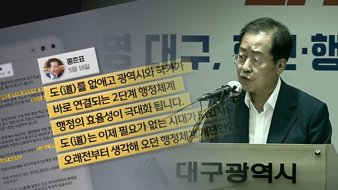 홍준표 당시 대구시장 (2022년 7월 5일 취임 기자간담회) "수도권 집중을 막기 위해서 행정 통합을 한다. 나는 그게 난센스 중의 난센스라고 봅니다."