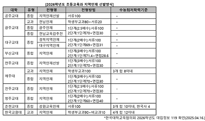 서울교대, 경인교대, 이화여대를 제외한 10개 대학은 지역인재전형을 운영한다. 지역인재전형은 해당 지역 고등학교 졸업(예정)자 등 일정한 자격을 갖춘 경우에만 지원 가능하므로 반드시 대학별 요강을 통해 지원자격을 사전에 확인해야 한다.