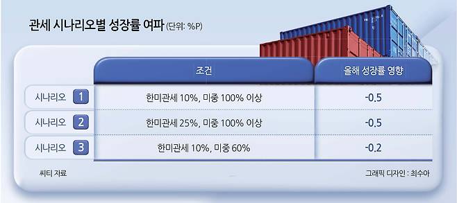 씨티는 옥스포드 이코노믹스 모델을 활용해 통상 협상에 따른 관세 충격이 한국 국내총생산(GDP) 성장률에 미치는 영향을 추산했다.