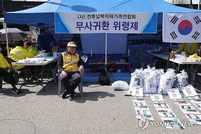 (파주=연합뉴스) 임병식 기자 = 23일 오전 경기도 파주시 임진각에서 대북전단 살포를 예고한 최성룡 납북자가족모임 대표가 대북전단 옆에 앉아 전달 살포에 맞는 풍향을 기다리고 있다. 2025.4.23