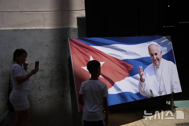 [아바나=AP/뉴시스] 22일(현지 시간) 쿠바 아바나의 자동차 박물관 입구에 전시된 프란치스코 교황 사진 앞에서 시민들이 사진을 찍고 있다. 이 박물관에는 2015년 교황의 쿠바 방문 당시 사용됐던 교황 차가 전시돼 있다. 2025.04.23.