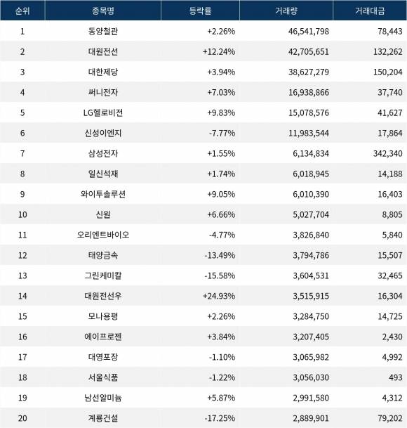 한편 거래량 상위 20위권 종목들은 오리엔트바이오(002630) ▼4.77%, 태양금속(004100) ▼13.49%, 그린케미칼(083420) ▼15.58%, 대원전선우(006345) ▲24.93%, 모나용평(070960) ▲2.26%, 에이프로젠(007460) ▲3.84%, 대영포장(014160) ▼1.10%, 서울식품(004410) ▼1.22%, 남선알미늄(008350) ▲5.87%, 계룡건설(013580) ▼17.25% 등의 성적을 기록했다.