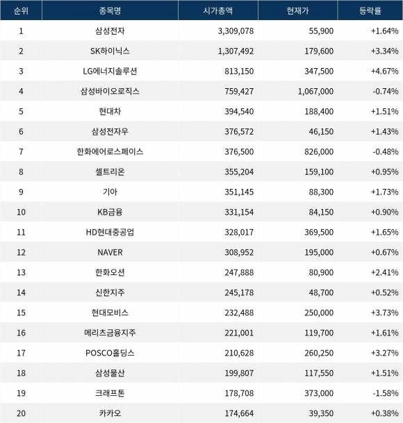 삼성바이오로직스(207940) -0.74% 한화에어로스페이스(012450) -0.48% 셀트리온(068270) +0.95%