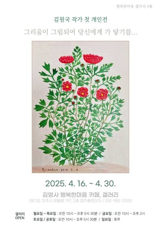 경기도 파주시 김영사 행복한마음 카페 갤러리에서는 4월 16일부터 30일까지 김원국 작가의 첫 개인전이 개최된다.