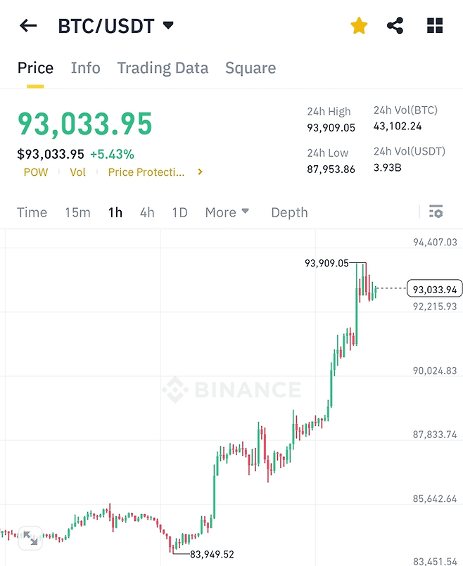 23일 비트코인은 오후 12시 48분 기준으로 24시간 전보다 5.43% 오른 9만3033달러에 거래되고 있다.