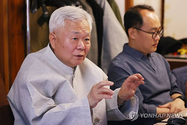 (서울=연합뉴스) 진연수 기자 = 한선학 원주 명주사 고판화박물관장이 23일 오후 서울 종로구 선천에서 열린 명주사 고판화박물관 '동아시아 미공개 고판화 명품전' 기자간담회에서 작품을 소개하고 있다. 2025.4.23