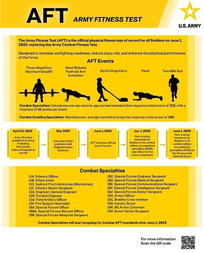 새 체력시험은 데드리프트, 팔굽혀펴기, 플랭크, 전력 질주와 중량 다루기, 2마일 달리기 등 5개로 구성된 기존 시험과 유사합니다.