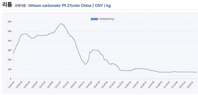 23일 한국광해광업공단에 따르면 지난 22일 상하이거래소 기준 탄산리튬의 가격은 ㎏ 68위안이었다. 2022년 11월 581.5달러로 고점을 찍었던 리튬가는 2023년 상반기 과잉투자에 의한 공급 과잉이 나타나며 떨어지기 시작했고, 전기차 캐즘(대중화전 일시적 수요침체) 우려에 지난해에는 100달러 선까지 하락한바 있다. 올들어서도 글로벌 배터리 시장이 회복하는 모습을 보이지 못하자 지속적인 가격하락이 이어지고 있다는 분석이다.