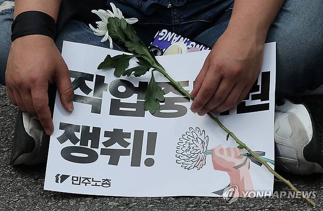 (서울=연합뉴스) 서명곤 기자 = 23일 서울 중구 서울고용노동청 앞에서 작업중지권과 노동자 참여 산업안전보건법 개정을 촉구하기 위해 열린 민주노총 결의대회에서 한 참가자가 국화꽃을 들고 있다. 2025.4.23