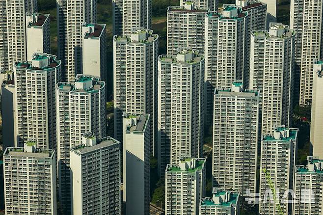 [서울=뉴시스] 정병혁 기자 = 23일 서울 송파구 롯데월드타워 전망대 서울스카이에서 도심 아파트가 보이고 있다.