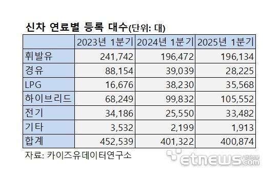 전동화 모델을 제외한 순수 내연기관차는 판매가 정체되거나 하락했다. 휘발유차 등록 대수는 전년(19만6472대)과 같은 수준인 19만6134대로, 전체 등록 대수의 절반가량을 차지했다.