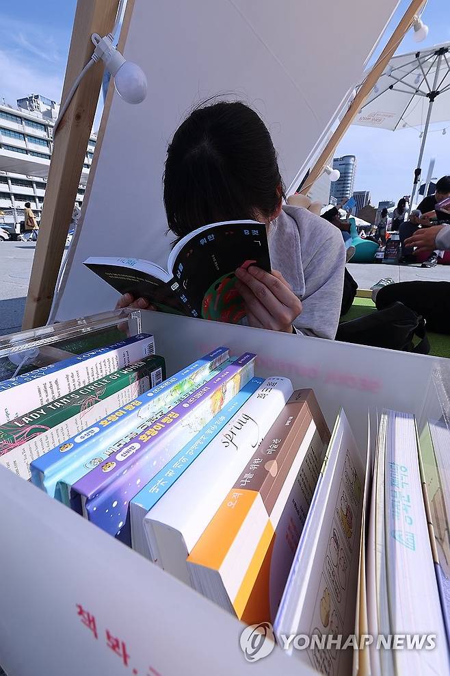 (서울=연합뉴스) 서대연 기자 = '세계 책과 저작권의 날'을 맞아 서울야외도서관이 운영을 시작한 23일 서울 종로구 광화문광장에 마련된 '광화문 책마당'에서 시민들이 독서를 즐기고 있다.