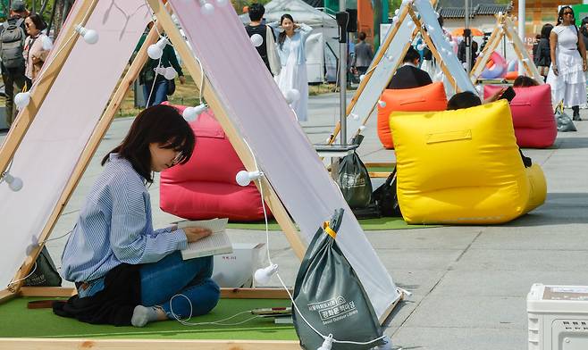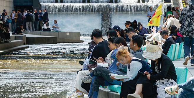 23일 서울 낮 최고 온도가 24도까지 올라 초여름 날씨를 보였다. 서울시가 서울야외도서관 일환으로 23일 광화문광장에서 ‘광화문 책마당’을, 청계천에서 ‘책읽는 맑은냇가’를 연 가운데 시민과 관광객들은 가벼운 옷차림으로 독서를 즐겼다.