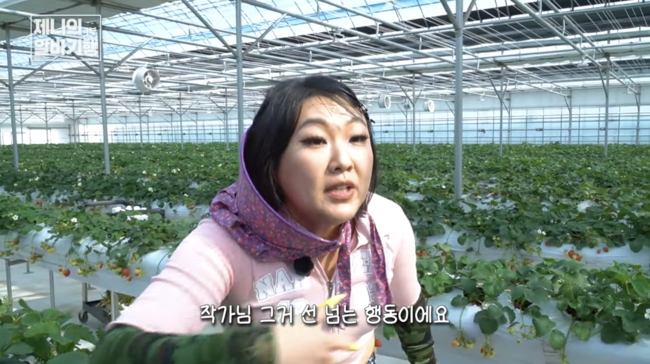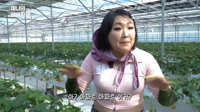 공개된 영상에는 이수지의 부캐 교포쇼녀 '제니'가 등장, 핑크색 크롭 티와 몸빼바지를 입은 채 딸기밭에서 일을 하는 근황을 전했다.