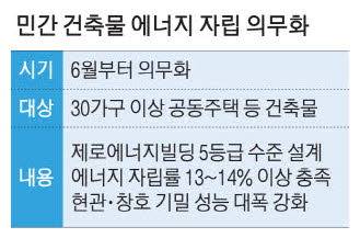 23일 국토교통부에 따르면 6월부터 30가구 이상 공동주택 등 민간 건축물도 인허가를 받을 때 제로에너지빌딩(ZEB) 5등급 수준의 설계 기준을 충족해야 한다. ZEB 등급은 단위 면적당 에너지 소비량 대비 생산량으로 계산되는 에너지 자립률에 따라 최고 1등급(100%)에서 최저 5등급(20% 이상~40% 미만)으로 나뉜다.