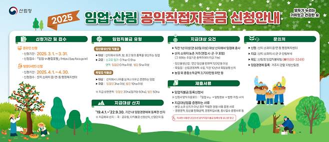 지급 대상은 2019년 4월1일부터 2022년 9월30일까지 임야 대상 농업경영체로 등록된 산지에서 직전 1년 이상(연간 60일 이상) 임업에 종사한 임업인 등의 요건을 갖춰야 한다.