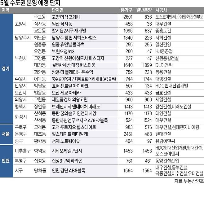 부동산 정보 업체 부동산인포에 따르면 이달 말부터 5월까지 분양 예정 단지는 총 23곳, 2만4341가구다. 이 중 1만5558가구가 일반분양분이다. 지역별로는 경기가 1만924가구로 가장 많으며 이어 인천(3478가구), 서울(1156가구) 순이다.