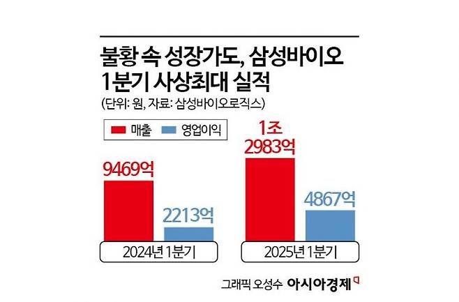 역대 최대 실적 또 다시 경신한 1분기23일 삼성바이오로직스는 공시를 통해 올해 1분기 연결기준 매출 1조2983억원, 영업이익 4867억원의 실적을 기록했다고 밝혔다. 전년과 비교해 매출은 37.1%, 영업이익은 119.9% 오른 수치다. 직전 분기인 4분기 매출 1조2564억원, 영업이익 3257억원에 비해서도 상승세를 유지했다.