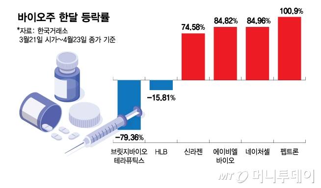 한 달 수익률 기준(3월21일~4월23일)으로는 에이비엘바이오와 펩트론이 각각 84.82%, 100.9% 급등했다.