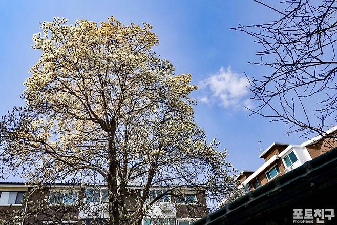우윳빛 목련나무도 꽃망울을 터뜨렸습니다.