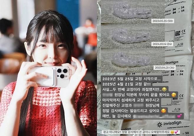 [TV리포트=이지은 기자] '지붕뚫고 하이킥'으로 유명한 배우 서신애가 반가운 근황을 전했다. 22일 서신애는 개인 채널에 "2023년 5월 25일 교정 시작으로 2025년 4월 21일 교정 끝!!"이라는 글과 함께 자신이 치아 교정을 위해 사용했던 투명 장치를 공개했다.