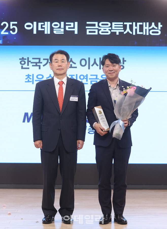 [이데일리 이영훈 기자] 정효영 미래에셋증권 본부장(오른쪽)이 23일 오후 서울 중구 KG하모니홀에서 열린'2025 이데일리 금융투자대상'에서 한국거래소 이사장상 퇴직연금운용 부문 수상을 한 뒤 기념촬영을 하고 있다.
