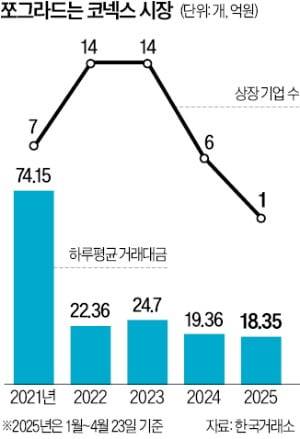 유망 기업 상장이 줄며 거래량도 쪼그라들었다. 올해 들어 이날까지 코넥스시장 하루평균 거래대금은 18억3500만원에 그쳤다. 지난해 19억3600만원, 2023년 24억7000만원으로 최근 3년 사이에 34.60% 감소했다. 지난 1분기 자금 조달 규모는 315억원으로 지난해 동기(513억원) 대비 38.60% 줄었다.