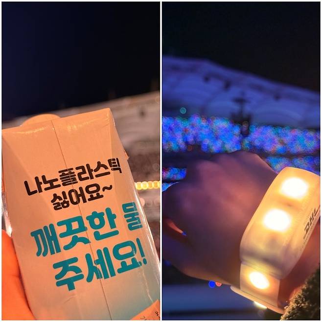 공연이 시작되기 전부터 대형 스크린에는 One Tree Planted, The Ocean Cleanup 등 콜드플레이와 협업하는 환경단체를 선전하는 영상이 재생됐다. 티켓 수익금·굿즈 판매의 일부가 산림 복원·해양 정화·탄소 포집 기술 지원·환경법 제정 등에 사용된다는 내용이 담긴 안내였다. 콜드플레이가 좋아 공연장에 온 것뿐인데, 무언가 환경에 도움이 되는 일에 일조하는 것 같은 기분이 들었다.