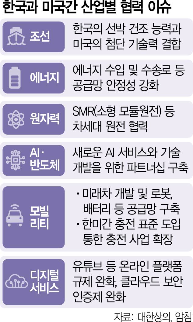 삼성전자(005930)와 SK하이닉스(000660) 등 국내 반도체 기업은 미국의 AI 패권과 직결된 반도체 공급망에 한국이 기여하는 바를 설명할 것으로 예상된다. 실제 주요 반도체 생산 기업이 모두 미국 이외 지역에 위치해 있는 만큼 관세를 물릴 경우 미국 기업들은 득보다 실이 훨씬 크다. 같은 맥락에서 반도체 보조금 집행도 요청할 것으로 보인다.