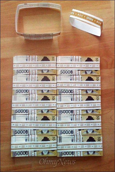 | ▲ 2012년 4월 4일, <오마이뉴스>를 통해 공개된 5000만 원 돈뭉치 사진. 당시 장진수 전 국무총리실 주무관은 민간인 불법사찰 사건을 폭로하면서 자신에게 청와대 측이 입막음용으로 전달했다고 증언했다. |