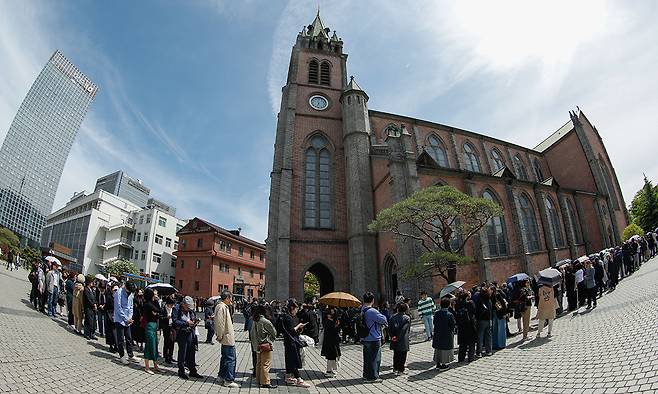 | 마지막 길 배웅 23일 프란치스코 교황의 공식 분향소가 마련된 서울 중구 명동대성당 앞에 조문 행렬이 이어지고 있다. 분향소는 교황 장례 미사가 바티칸에서 거행되는 26일 오후 5시(현지시간 오전 10시)까지 운영된다. 천주교 서울대교구는 24일 오전 10시 명동대성당에서 교구 주교단과 사제단 공동집전으로 ‘프란치스코 교황 추모 미사’를 봉헌한다. 최상수 기자 |