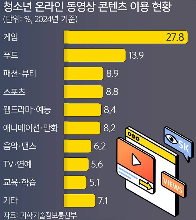 23일 과학기술정보통신부의 ‘2024 스마트폰 과의존 실태조사’에 따르면 청소년(만 10∼19세)이 유튜브 등 온라인 동영상 서비스를 통해 가장 많이 소비하는 콘텐츠는 ‘게임’(27.8%)으로 전 연령대에서 비중이 가장 높은 것으로 나타났다. 다음으로는 푸드(13.9%), 패션·뷰티(8.9%) 순이었다. 이 같은 유튜브 콘텐츠들은 폭력성과 선정성이 짙었다. 과기부가 지난해 9∼11월 청소년 2194명에 자신이 시청하는 온라인 동영상 콘텐츠의 성향에 대해 설문한 결과 42.0%는 “폭력성이 있다”고 답했고 28.6%가 “선정성이 있다”고 했다. 폭력성의 경우 성인(40.7%)보다 높게 나타났고, 선정성은 성인(29.6%)과 비슷한 수준이었다.