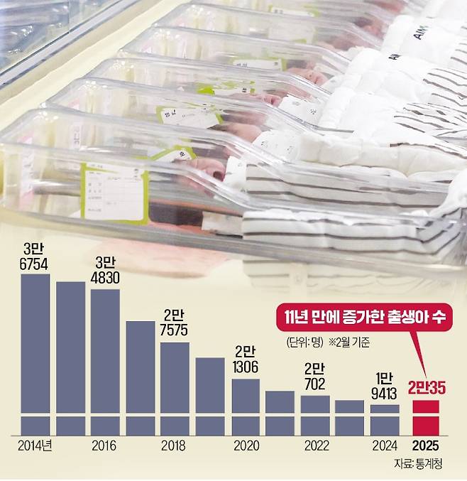 지난 2월 태어난 아기가 2만 명을 넘어서 11년 만에 반등했다. 여성 한 명이 평생 동안 낳을 것으로 예상되는 출생아 수를 뜻하는 합계출산율은 지난 1월에 이어 2월에도 0.8명을 넘어섰다. 전문가들은 이 같은 저출생 완화 흐름을 이어가기 위해 만 30~34세 여성 인구가 줄어들기 전 ‘골든타임’을 놓치지 않아야 한다고 강조했다.