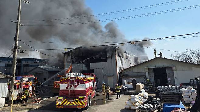 직원 등 6명이 대피해 인명 피해는 없었지만, 공장 1동이 모두 불에 타고 창고 1동 지붕도 일부 소실됐습니다.