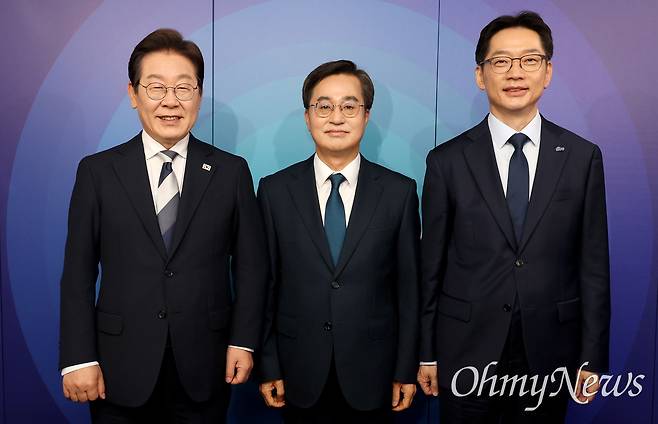 | ▲ 더불어민주당 제21대 대통령선거 경선에 나선 이재명(왼쪽부터), 김동연, 김경수 예비후보가 23일 오후 서울 여의도 오마이TV 스튜디오에서 열린 오마이TV 초청 토론회 시작하기에 앞서 기념촬영을 하고 있다. |