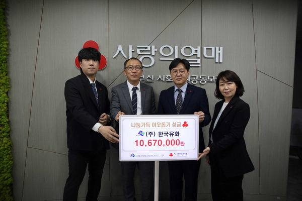 ㈜한국유화(대표 신구봉)는 지난 18일 부산사회복지공동모금회(회장 이수태·부산사랑의열매)에 이웃사랑성금 1067만 원을 기탁(사진)했다고 23일 밝혔다.
