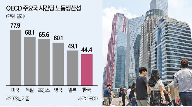 역대 최대 이익을 낸 작년과 달리 올해 경영 환경이 불확실해진 점도 금융회사들의 고민거리다. 노동생산성을 높여 수익을 극대화하는 게 새로운 숙제로 떠올랐다는 얘기다. 경제협력개발기구(OECD)에 따르면 한국 노동생산성은 시간당 44.4달러(2023년 기준)로 OECD 38개국 중 33위에 그쳤다.