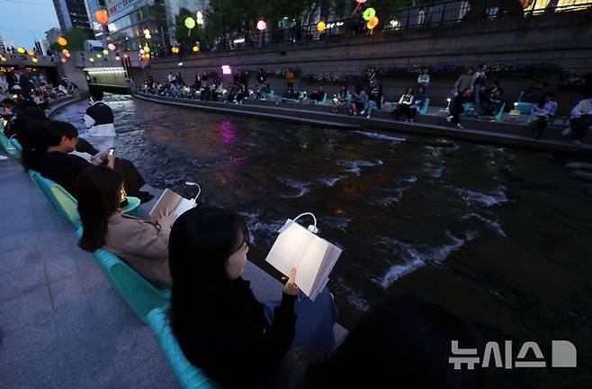 [서울=뉴시스] 홍효식 기자 = '세계 책과 저작권의 날'을 맞아 서울야외도서관 운영을 시작한 23일 오후 서울 중구 청계천에 마련된 '책 읽는 맑은 냇가'에서 시민들이 독서를 즐기고 있다. 2025.04.23. yesphoto@newsis.com