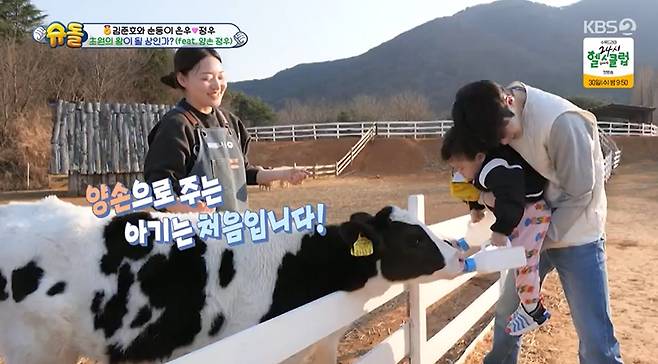 정우의 용기는 여기서 멈추지 않았다. 김준호가 송아지에게 우유를 먹이는 모습을 본 정우는 "정우도 먹을 거야"라며 스스로 나섰다. 얼굴보다 큰 우유 통을 양손에 들고 두 마리 송아지에게 동시에 먹이를 주는 모습으로 모두를 놀라게 했다.